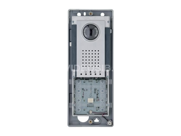 Корпус из технополимера с хромированной шлифованной отделкой цвета «металлик». Оборудована камерой 1/4 CMOS разрешением 640x480 со встроенным микропроцессором для цифровой обработки сигнала. Широкоугольный объектив «рыбий глаз» с углом обзора 100° по горизонтали и 82° по вертикали с регулируемым цифровым увеличением. Оснащается клеммой для подключения электромеханического замка (0,5 A, 12 В), дополнительным "сухим" контактом (1 A, 24 В макс.), входами для кнопки открытия двери и контроля за состоянием двери (программируемый вход/выход), выходом для активации внешнего освещения (программируемый вход/выход). Клеммная колодка для подключения к сети, питание PoE или от местного источника. На передней стороне располагаются светодиоды для визуальной индикации состояния системы. Синяя подсветка кнопок с именными карточками абонентов c регулируемой интенсивностью. Для настройки и обновления прошивки используется встроенный веб-интерфейс. Питание по технологии PoE или локально (=12 – 24 В).