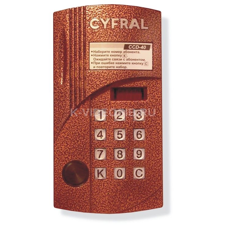 Цифрал CCD-40/РVС имеет встроенную цветную видеокамеру и рассчитан на работу с видеомониторами "Цифрал", также встроенный считыватель бесконтактных ключей и собственный процессор для их обработки.