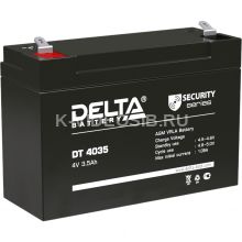 Герметизированный VRLA cвинцово-кислотный аккумулятор Delta DT 4035 напряжением 4В и емкостью 3.5Ач изготовлен по технологии AGM (с микропористым заполнителем, пропитанным электролитом). Корпус изготовлен из негорючего ABS пластика. Срок службы аккумулятора рассчитан на 3-5 лет работы. Аккумулятор предназначен для работы в режиме постоянного подзаряда (т.н. буферный режим), обладает низким внутренним сопротивлением и саморазрядом.