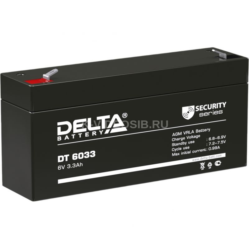 Герметизированный VRLA cвинцово-кислотный аккумулятор Delta DT 6033 (125) напряжением 6В и емкостью 3.3Ач изготовлен по технологии AGM (с микропористым заполнителем, пропитанным электролитом). Корпус изготовлен из негорючего ABS пластика. Срок службы аккумулятора рассчитан на 3-5 лет работы. Аккумулятор предназначен для работы в режиме постоянного подзаряда (т.н. буферный режим), обладает низким внутренним сопротивлением и саморазрядом.