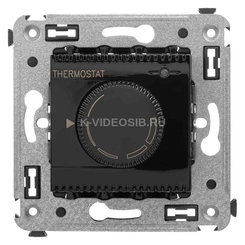 Термостат для теплых полов. Назначение: для монтажа в подрозеточные коробки глубиной не менее 45 мм (код 59301);. Предназначен для управления теплыми полами. Характеристики: диапазон от 5 до 30 °С; частота – 50–60 Гц; номинальное напряжение – 230 В; лампа-индикатор включается, когда температура в комнате падает ниже выбранного значения; нагрузка: 12 A – cosφ=1; 4,8 A – cosφ=0,4; фиксация в подрозеточные коробки глубиной не менее 45 мм при помощи каркаса с лапками (код 4400802) и саморезов; провод датчика температуры в комплекте (длина 3,5 метра). Цвет: "Черный квадрат".