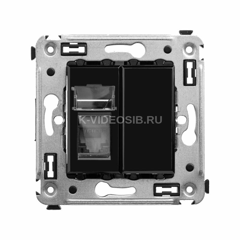 Компьютерная розетка двойная используется для подключения компьютерной техники или же соединения с патч-панелью. Компьютерная розетка предназначена для скрытого монтажа в стену. Розетка RJ-45 категории 5e – это наиболее популярная на сегодняшний день модель. Она позволяет организовать сеть с частотой 125 МГц и скоростью до 1000 Мбит/с. Материал – металл, термопласт. Пластиковые части устройства имеют оттенок "Черный квадрат" – самый глубокий, таинственный и многогранный оттенок из всей палитры цветовых решений "Avanti".