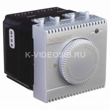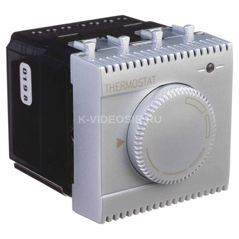 Характеристики: диапазон от 5 до 30 °С; частота – 50–60 Гц; номинальное напряжение – 230 В; лампа-индикатор включается, когда температура в комнате падает ниже выбранного значения; нагрузка: 12 A – cosφ=1, 2 A – cosφ=0,4; фиксация в подрозеточные коробки глубиной не менее 45 мм при помощи каркаса с лапками (код 4400802) и саморезов. Кол-во модулей: 2. Цвет: "Закаленная сталь".
