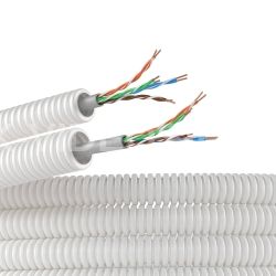 Безгалогеновые электротехнические гибкие гофрированные трубы изготовлены из специального полимера, который не выделяет вредных веществ при нагревании. Это их свойство делает такие трубы незаменимыми при строительстве и прокладке кабеля на объектах, предназначенных для пребывания большого количества людей. Электротруба - это гофрированная труба с уже протянутым внутри информационным кабелем витая пара CAT 5E U/UTP нг(А)-HF. Такое решение значительно сокращает время монтажа и предупреждает возможное повреждение кабеля при протяжке. Характеристики кабеля: категория (Cat) - 5Е, кол-во жил – 8, диаметр проводника – 0,51 мм, тип исполнения - нг(А)-HF. Характеристики трубы: гофрированная труба ПЛЛ диаметром 16мм, цвет - белый. 50м в бухте.