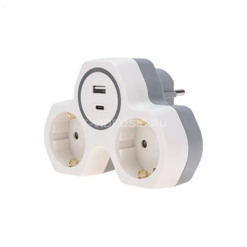 Двойник электрический (разветвитель) 16А с/з + USB-A + USB-C с защитными шторками, белый REXANT (11-1253)
