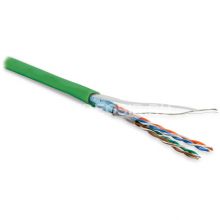Экранированный кабель витая пара Hyperline FUTP4-C5E-P26-IN-LSZH-GN-100, F/UTP, категория 5e. 4 витые пары в экране из алюминизированной полиэстерной пленки, покрыты LSZH оболочкой (малодымный безгалогенный компаунд). Предназначен для прокладки внутри помещений. Конструкция проводников: многопроволочная (stranded). Внешний диаметр: 5.4 мм.