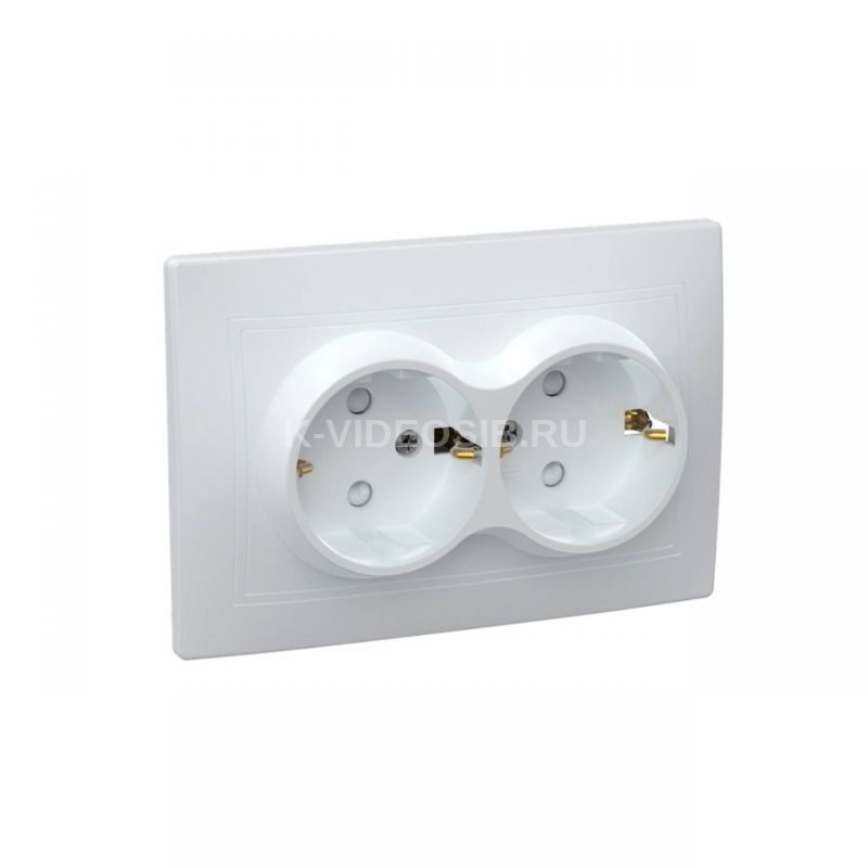 РСш12-3-КБ Розетка 2-местная с заземлением (з/к), с защитными шторками, 16А, серия КВАРТА (белый) — электроустановочное изделие бытового назначения, двухместная розетка стандарта SCHUKO (тип F) с заземляющими контактами и защитными шторками (безопасность от детей), номинальный ток 16А, цвет корпуса белый, серия "КВАРТА", предназначена для скрытого или открытого монтажа в жилых и коммерческих помещениях.