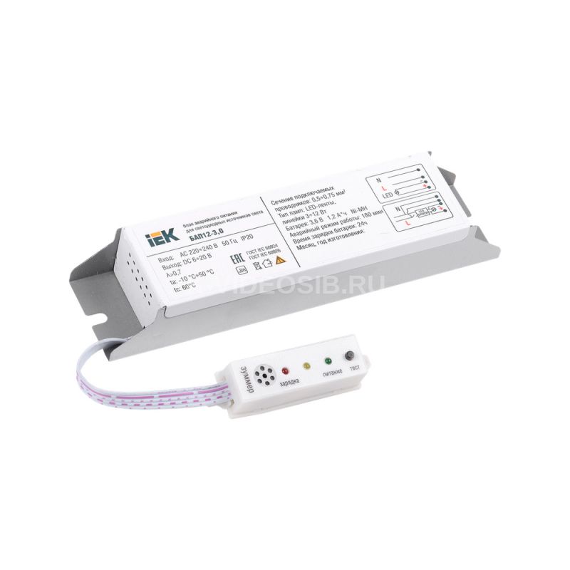 Блок аварийного питания БАП12-3,0 для LED IEK обеспечивает бесперебойную работу светодиодных светильников в случае непредвиденного отключения сети 230В или при снижении напряжения ниже порогового уровня. Блок включает 1 подключенную светодиодную линейку. БАП12-3 IEK встраивается в светильник или в выносной бокс и обеспечивает работу в аварийном режиме светодиодных ламп, светодиодных модулей (СИД) и светодиодных лент напряжением питания 6-20 В и максимальной мощностью от 3 Вт до 12 Вт. В дополнение к БАП 12 предлагается светодиодная линейка LED-18SMD2835 IEK, рассчитанная специально на работу с данным блоком. Использование БАП 12 со светодиодной линейкой LED-18SMD2835 позволит организовать аварийное освещение светильников любых типов (с ЛЛ, LED).