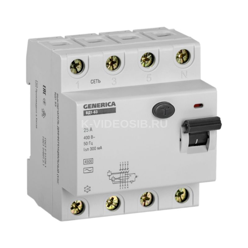 Быстродействующий защитный выключатель ВД1-63 (УЗО) GENERICA - устройство электронного типа, зависящее от напряжения и реагирующее на дифференциальный ток, без встроенной защиты от сверхтоков. Предназначен для защиты человека от поражения электрическим током.