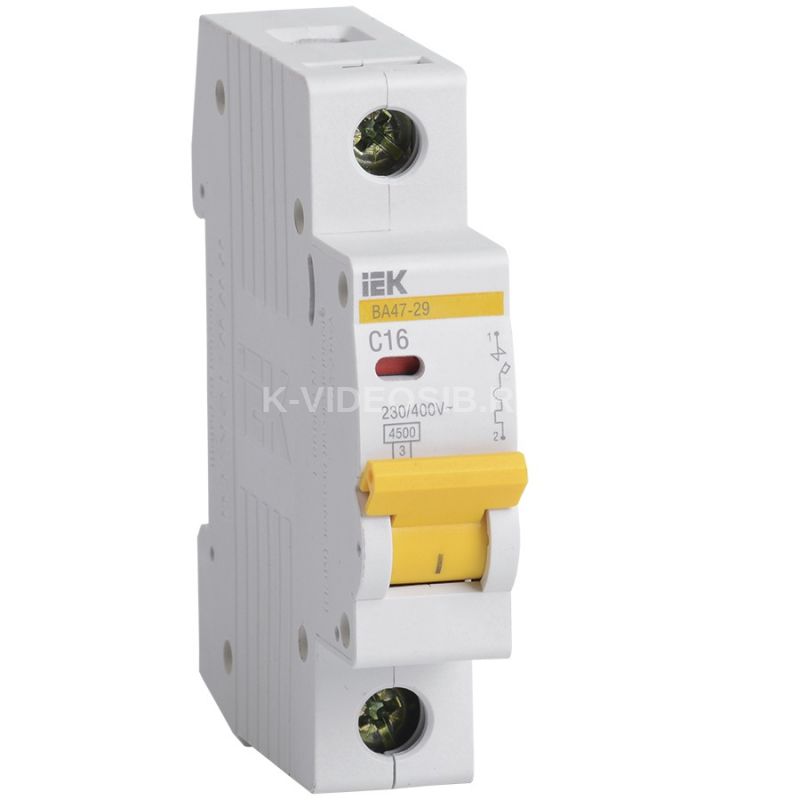 IEK MVA20-1-016-C - выключатель автоматический ВА47-29 1Р 16А 4,5кА х-ка С ИЭК. Автоматические выключатели ВА47-29 предназначены для защиты распределительных и групповых цепей, имеющих различную нагрузку: – электроприборы, освещение – выключатели с характеристикой В, – двигатели с небольшими пусковыми токами (компрессор, вентилятор) – выключатели с характеристикой C, – двигатели с большими пусковыми токами (подъемные механизмы, насосы) – выключатели с характеристикой D. Автоматические выключатели ВА47-29 рекомендуются к применению в вводно-распределительных устройствах для жилых и общественных зданий. Два типа защиты от перегрузки и короткого замыкания. Полный комплект дополнительных устройств с возможностью простой самостоятельной установки: – контакт состояния КС47; – контакт состояния КСВ47; – расцепитель минимального напряжения РММ47; – расцепитель независимый РН47. Усовершенствованная дугогасительная система: увеличенный срок службы, повышенная устойчивость к токам короткого замыкания. Возможность одновременного присоединения шиной FORK и гибким проводником для распределения питания цепи через верхние зажимы, а также возможность соединения шиной PIN. Наличие индикатора положения контактов. Широкий диапазон рабочих температур от -40 до +50 °С. Новый эргономичный дизайн рукоятки включения/выключения. Насечки на контактных зажимах снижают тепловые потери и увеличивают механическую устойчивость соединения.