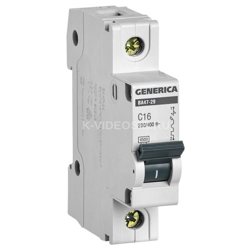 Автоматический выключатель ВА47-29 1Р 16А 4,5кА С GENERICA IEK MVA25-1-016-C. Автоматические выключатели ВА47-29 GENERICA предназначены для защиты распределительных и групповых цепей, имеющих различную нагрузку: – электроприборы, освещение – выключатели с характеристикой В, – двигатели с небольшими пусковыми токами (компрессор, вентилятор) – выключатели с характеристикой C, – двигатели с большими пусковыми токами (подъемные механизмы, насосы) – выключатели с характеристикой D. Автоматические выключатели ВА47-29 рекомендуются к применению в вводно-распределительных устройствах для жилых и общественных зданий.