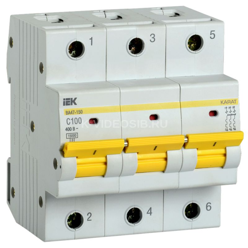 KARAT Автоматический выключатель ВА47-150 3P C 100А 15кА IEK MVA50-3-100-C. Автоматические выключатели ВА47-150 предназначены для защиты распределительных и групповых цепей от высоких токов короткого замыкания. Рекомендуются к применению во вводно-распределительных устройствах бытовых и промышленных электроустановок. Предельная отключающая способность 15000 А. 32 типоисполнения на 4 номинальных тока. Характеристики срабатывания С и D.