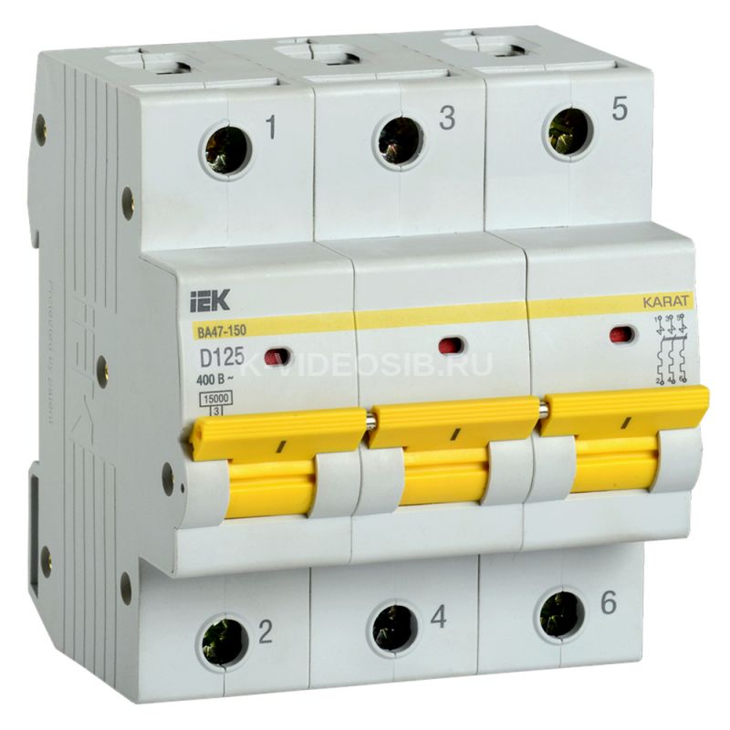 KARAT Автоматический выключатель ВА47-150 3P D 125А 15кА IEK MVA50-3-125-D. Автоматические выключатели ВА47-150 предназначены для защиты распределительных и групповых цепей от высоких токов короткого замыкания. Рекомендуются к применению во вводно-распределительных устройствах бытовых и промышленных электроустановок. Предельная отключающая способность 15000 А. 32 типоисполнения на 4 номинальных тока. Характеристики срабатывания С и D.