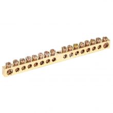 Шина PEN "земля-ноль" 6х9мм 16/1 (16групп/крепеж по центру) IEK YNN10-16-100. Применяются в щитовом оборудовании для подсоединения нулевых рабочих (N) и нулевых защитных проводов (РЕ). Крепление шины предусмотрено по центру (типы 8/1; 14/1) и по краям (типы 8/2 и 14/2) через изолятор нулевой шины на 35 мм монтажную DIN-рейку и через угловые изоляторы нулевой шины, а также непосредственно на панель щита. При подключении к шинам медных многожильных проводов рекомендуется оконцевание их наконечниками-гильзами. Выполнены из латуни.
