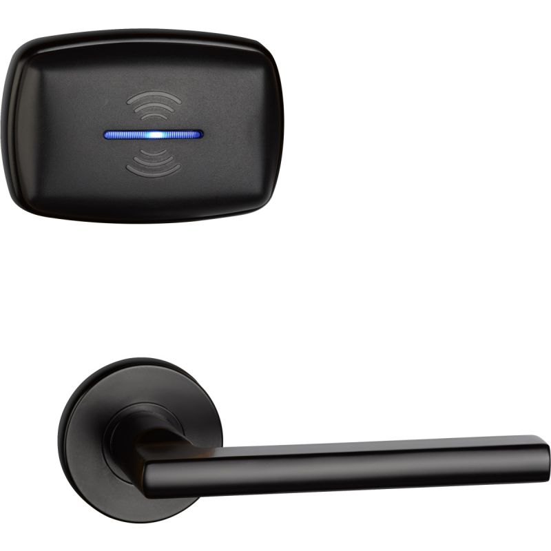 Раздельный дизайн замка. Питание - 6В (4 батарейки типа ААА). Материал корпуса - сталь AISI 304. Цвет - черный, способ нанесения покрытия - PVD. Материал врезного механизма - сталь AISI 304. Считыватель - Mifare. Сертификат соответствия ГОСТ Р.