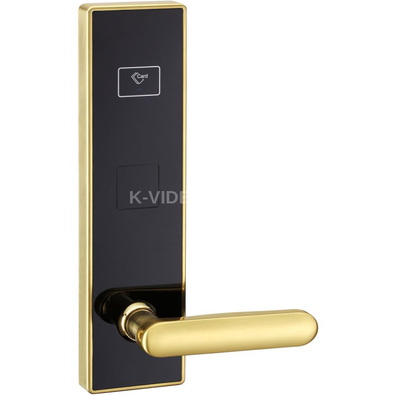 Электронный замок. Питание - 6В (4 батарейки типа АА). Материал корпуса - цинковый сплав, акриловое стекло. Цвет - золото, способ нанесения покрытия - PVD. Материал врезного механизма - сталь AISI 304. Усиливающее кольцо в основании ручки. Считыватель - Mifare. Сертификат соответствия ГОСТ Р.