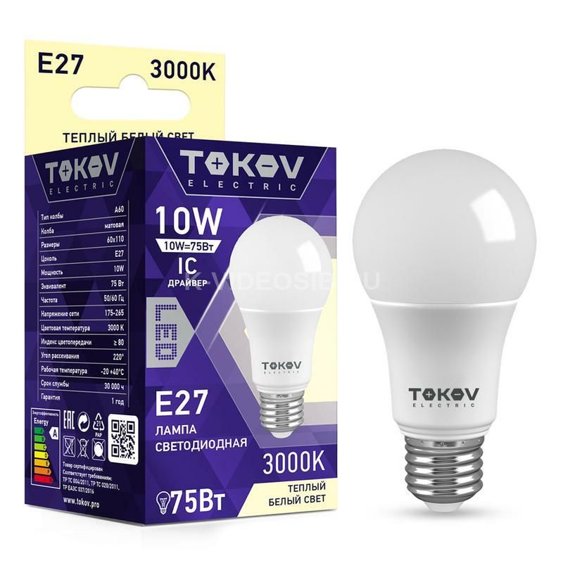 Описание Лампа светодиодная 10Вт А60 3000К Е27 176-264В TOKOV ELECTRIC TKE-A60-E27-10-3K