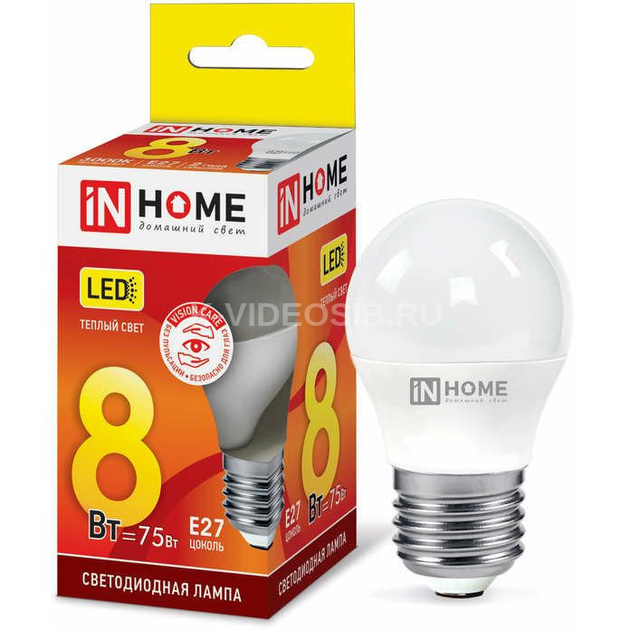 Технические характеристики Лампа светодиодная LED-ШАР-VC 8Вт 230В E27 3000К 720лм IN HOME 4690612020563