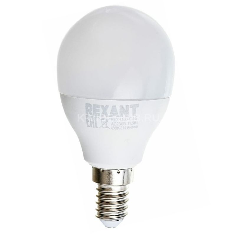 Лампа светодиодная Шарик (GL) 11,5Вт E14 1093Лм 2700K теплый свет REXANT (604-041). Светодиодная лампа с цоколем Е14 мощностью 11,5Вт выполнена в форме шара. Лампа с такой колбой не раздражает глаз и излучает теплый свет (2700K) без вредного мерцания. Имеет широкое применение, так как ее можно установить в любой осветительный прибор: люстру, светильник, декоративную светотехнику и т.д. Срок службы составляет 30 000 часов. Отличительные преимущества: гарантированный световой поток без потери мощности, высокая цветопередача, электромагнитная совместимость, низкая пульсация. Также использование такой лампы позволяет снизить расходы на электроэнергию.
