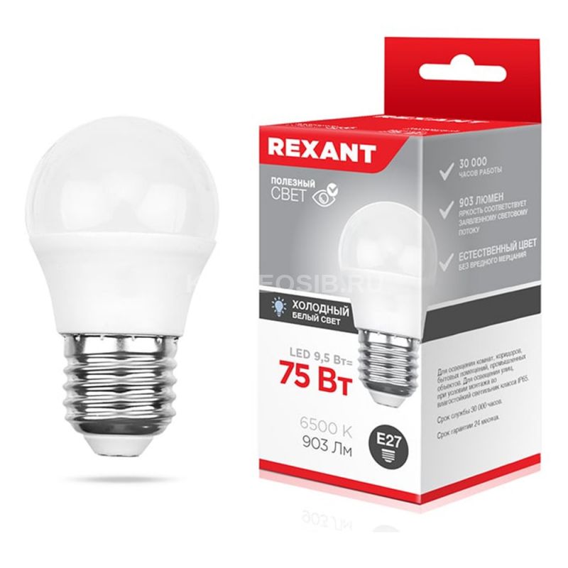 Технические характеристики Лампа светодиодная Шарик (GL) 9,5Вт E27 903Лм 6500K холодный свет REXANT (604-208)