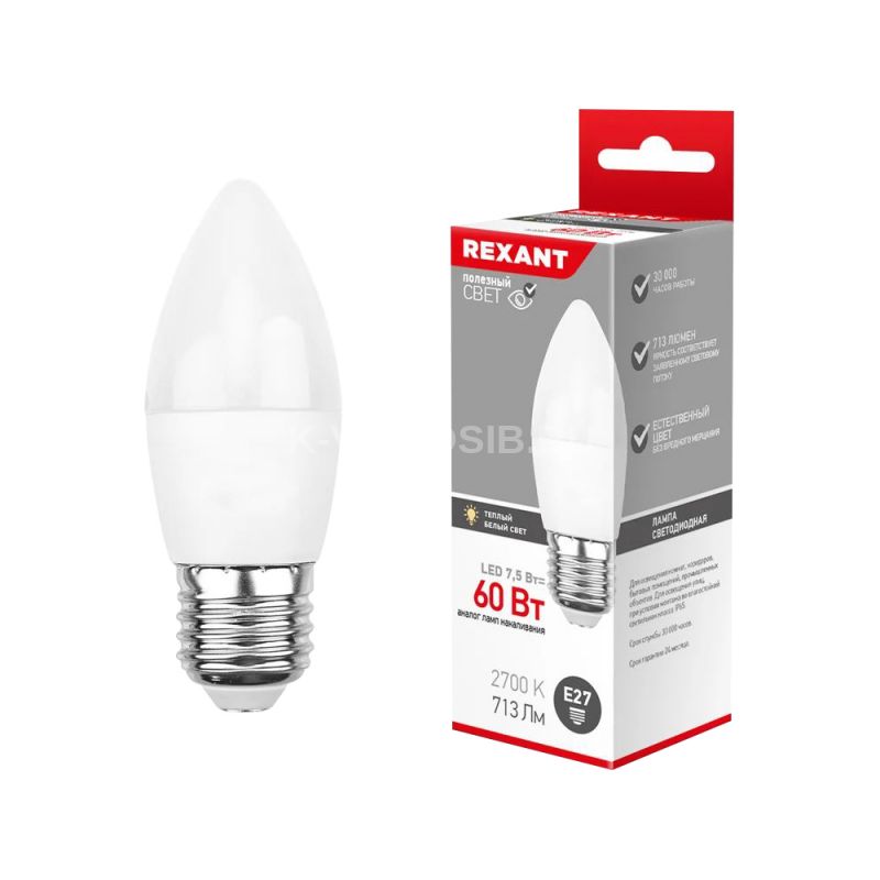 Описание Лампа светодиодная Свеча (CN) 7,5Вт E27 713Лм 2700K теплый свет REXANT (604-020)