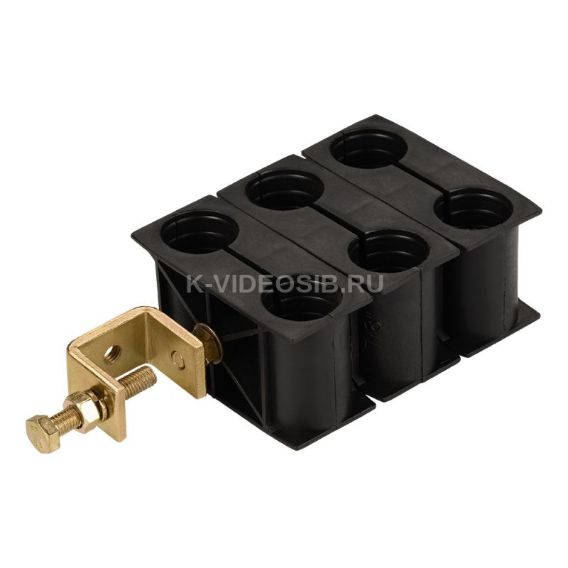 Элемент предназначен для фиксации коаксиальных кабелей к различным конструкциям при помощи струбцины. Выпускается в нескольких вариантах, поддерживает до 6 кабельных линий различного диаметра.