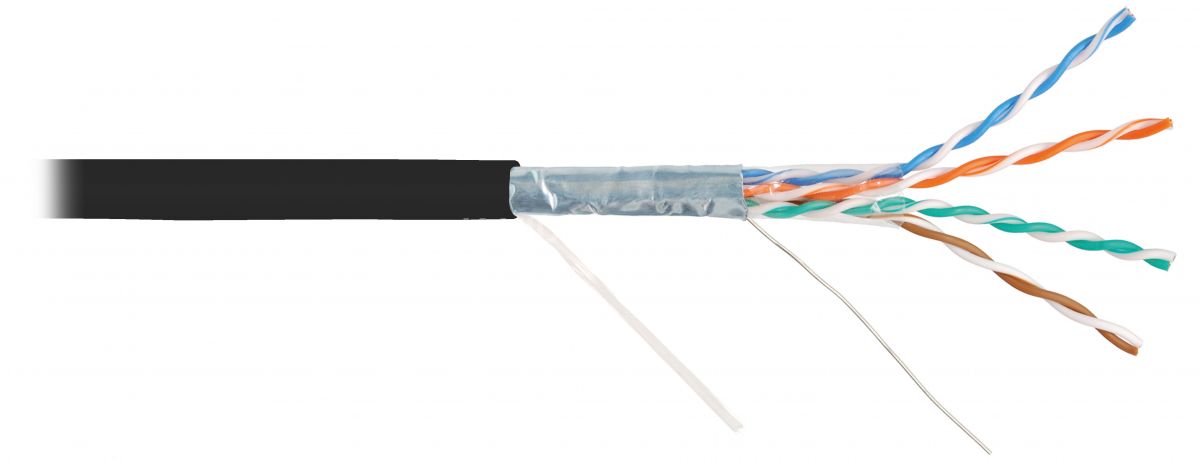 Кабель NMC выполнен 1201С-BK в экранированном исполнении F/UTP, соответствует категории 5e и предназначен для внутренней прокладки. Внешняя оболочка выполнена из не распространяющего горение при групповой прокладке и не выделяющего коррозионно-активных газообразных продуктов при горении и тлении, полимерного материала в исполнении нг(A)-HF