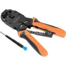 Обжимные инструменты (кримперы) предназначены для обжима коннекторов типа Registered Jack (RJ) на телефонных кабелях и кабелях передачи данных. Кримпер NMC-2008AR предназначен для обжима разъемов типа RJ45/8P8C, RJ12/6P6C, RJ11/6P4C, 4P4C и 4P2C. Инструмент оборудован устройством для зачистки и обрезки кабеля. Данный инструмент является профессиональным, благодаря “торцевому” обжиму и многофункциональности.