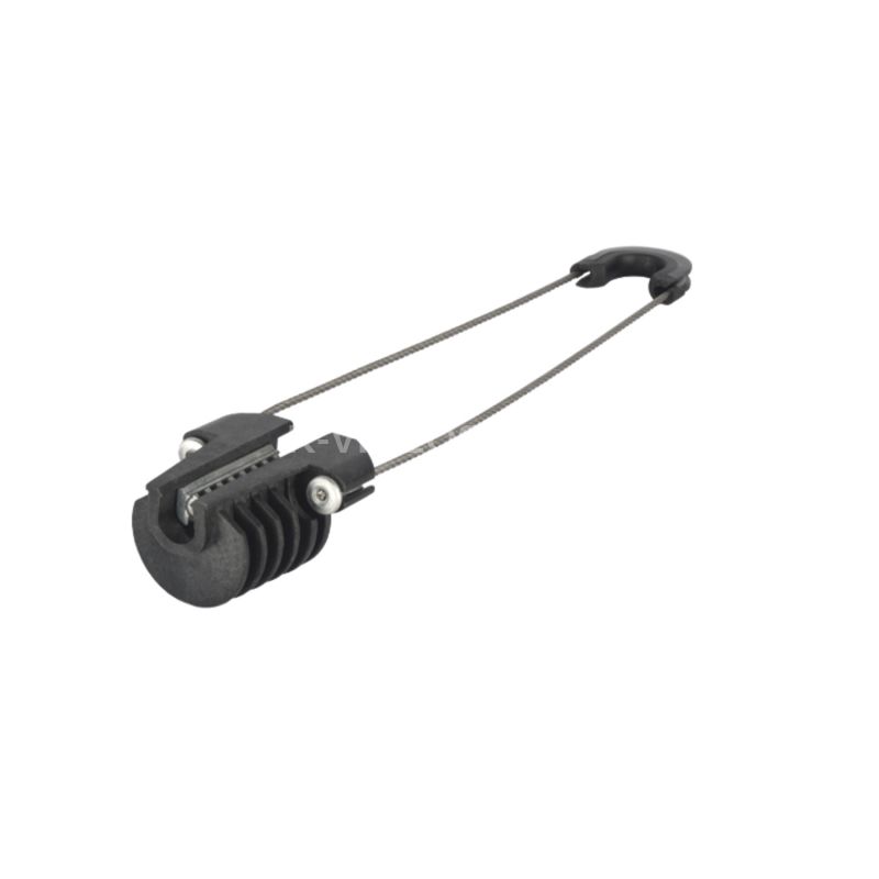 Анкерные зажимы предназначены для крепления и удержания в натянутом состоянии оптического кабеля с внешним силовым элементом типа "8" на опорах воздушных линий электропередачи, связи, городского электрохозяйства (уличного освещения, наземного электротранспорта), элементов зданий и сооружений при длине пролетов до 100 метров. Зажим анкерный натяжной NMF-AL-TCA-P-2 состоит из корпуса, сделанного из высокопрочного полимера, а также клиньев с зубьями, выполненных из сплава цинка.