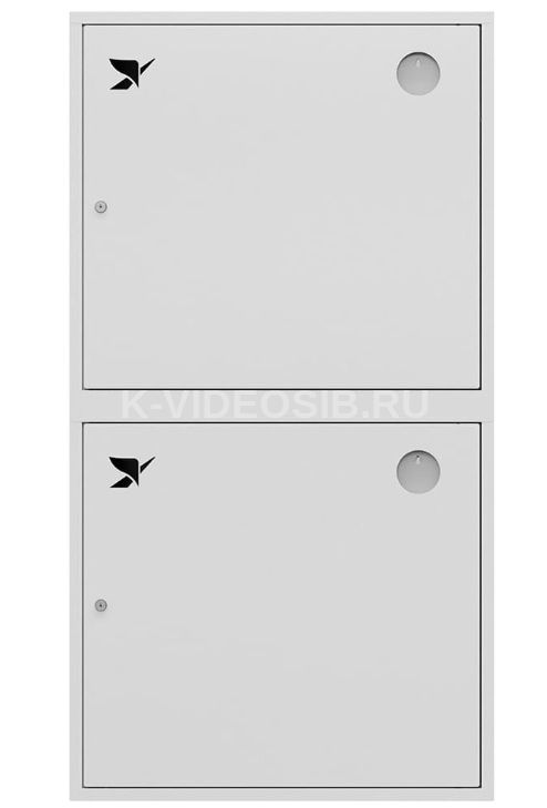 Секции шкафа имеют равные размеры и расположены друг над другом. Верхний отдел укомплектован двумя поворотными корзинами, в которых хранятся свернутые в скатку пожарные напорные рукава. В отделении внизу хранятся два огнетушителя.