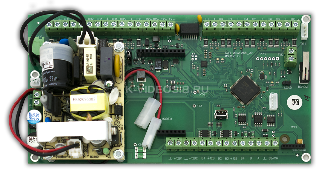 СОКРАТ ПУ КОП-04.1 - Плата управления контроллера Приток-А-КОП-04. Имеет 8 программируемых шлейфов (ОС, ПС, ТС), 4 силовых выхода и импульсный блок питания. Модуль GSM - разъем для установки. Модуль WiFi - разъем для установки.