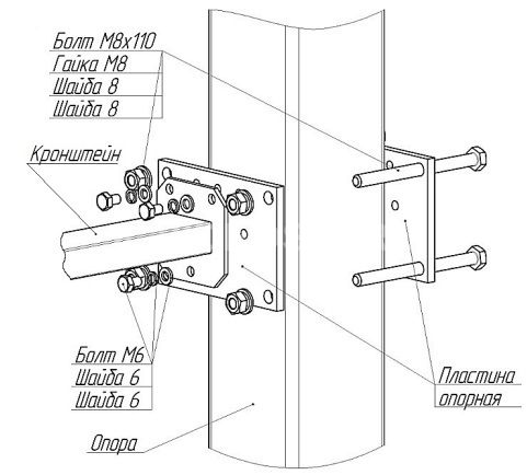 КМЧ-4ск состоит из четырех стальных оцинкованных пластин толщиной 5мм для установки извещателей ДПР‑10В, ДПР-200, ПРЕДЕЛ, АНТИРИС на прямоугольные опоры (без повреждения их сверлением), сетчатое и решетчатое полотно (если это не противоречит технической документации), а так же содержит болты М8х110 8 шт, с помощью которых крептся пластины опорные на опоре.