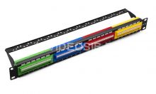 С тыльной стороны патч-панели размещены контакты типа Dual IDC с цветной маркировкой по двум стандартам: T568 А и B. Ножи контактов располагаются под 90°.