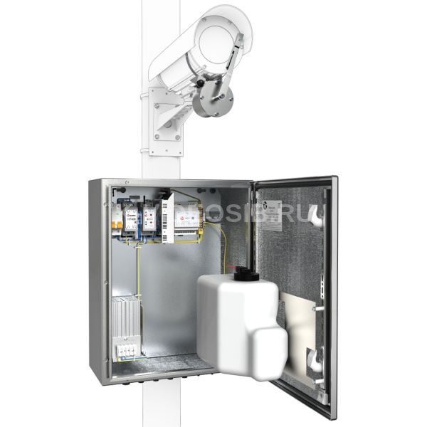 Комплект очистки стекла видеокамеры КОСВН. Комплект очистки стекла видеокамеры КОСВН предназначен для очистки стекла термокожуха видеокамеры от воды, снега и загрязнений с помощью механической щетки с использованием омывающей жидкости в условиях морского климата, химических производств, автомагистралей, тоннелей и прочих агрессивных сред. Входящий в состав комплекта стеклоочиститель СО-1 Ex предназначен для установки в наружные пространства и внутренние пространства помещений, порты, рудники и шахты, классифицированные как взрывоопасные зоны классов 1 и 2 (при классификации по зональному принципу), где возможно образование взрывоопасных газовых смесей категории IIА, IIВ и IIC групп взрывоопасности Т1-Т6 или взрывоопасные зоны класса В-1, В-1а, В-1б, В-1г согласно гл.7.3 ПУЭ. СО-1 Ex выполнен в виде взрывонепроницаемой оболочки по ГОСТ 31610.0 (IEC 60079-0), ГОСТ IEC 60079-1 с маркировкой взрывозащиты РВ Ex db I Mb X / 1Ex db IIC T6 Gb X / Ex tb IIIС T85°C Db Х cо степенью защиты обеспечиваемой оболочкой – IP66/IP67 и по уровню защиты относится к взрывобезопасному электрооборудованию. Установка шкафа во взрывоопасных зонах запрещена! Климатическое исполнение изделия соответствует УХЛ1,5 ГОСТ 15150. СО-1 Ex выпускается по техническим условиям ТУ 26.30.50-079-31006686-2018. Остальные элементы комплекта выпускаются по техническим условиям ТУ 26.30.50-077-31006686-2017. Состав КОСВН: