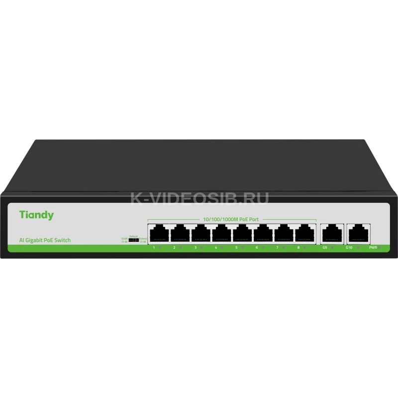 Неуправляемый РоЕ коммутатор, 10 портов(8 РоЕ RJ-45 х1Гбит/с+2 Uplink RJ-45 х1Гбит/с). РоЕ IEEE802.3af/at до 30Вт/порт. РоЕ бюджет 110Вт. Поддержка VLAN, PoE Watchdog, PoE Priority(1-8 порты), Extend режим 220м(7-8 порты). Питание AC 100-240В. Температура эксплуатации-10~50℃. Габариты в упаковке: 315х215х85мм, вес: 1.38 кг.