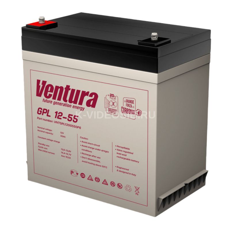 Аккумулятор Ventura GPL 12-55 - универсальная необслуживаемая стационарная аккумуляторная батарея общего назначения с увеличенным сроком службы и номинальным напряжением 12 В. Аккумуляторы Ventura GPL применяются в системахбесперебойного питания любых мощностей, медицине, телекоммуникациях, объектах информационных технологий, загородных домах и др. для работы в режиме постоянного подзаряда или циклическом режиме.