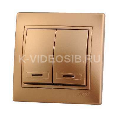 Описание Выключатель 2-кл. СП Мира 10А IP20 с подсветкой со вставкой зол. метал. LEZARD 701-1313-112