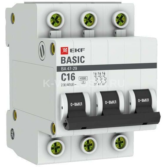 Выключатель автоматический модульный 3п C 16А 4.5кА ВА 47-29 Basic EKF mcb4729-3-16C