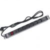 Блок евророзеток для 19" шкафов, горизонтальный, 6 розеток, фильтр, 16 A, выключатель, шнур 2м, алюминиевый корпус, немецкий стандарт